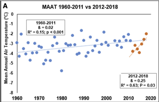 对这两种植物来说,“领土”扩张当然是件好事。然而看到这一幕后,研究者的心情却轻松不起来——在南极花开更多的背后,是当地气温的加速上升。记录显示,在1960-2011年,西格尼岛的年平均气温每年平均只上升0.02℃。然而在2011-2014年的异常降温事件后,这里的年平均气温开始急剧上升,年平均升温0.25℃。单看夏季的气温,加速上升的趋势也很明显。1960-2011年,50年间气温共增加了约1.2℃。但从2012年开始,仅仅7年内,夏季平均气温就增加了0.9℃。