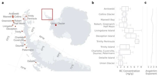 结果显示,在那些远离人类活动的地区,每克雪里约有1纳克(10亿分之一克)黑碳。然而在所有人类聚集区附近的样本中,黑碳浓度都明显更高——显然,这代表人类活动就是这些黑碳的来源。比如,在南设得兰群岛的北部,黑碳的浓度在3~5ng/g,南部的黑碳浓度则有4-7ng/g。黑碳浓度最高的样本,采集自阿根廷埃斯佩兰萨站东南方2千米远的地方,达到了8ng/g。