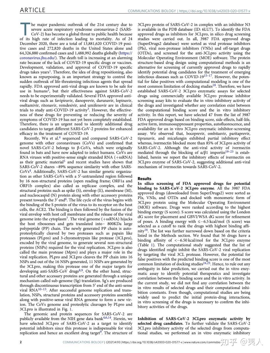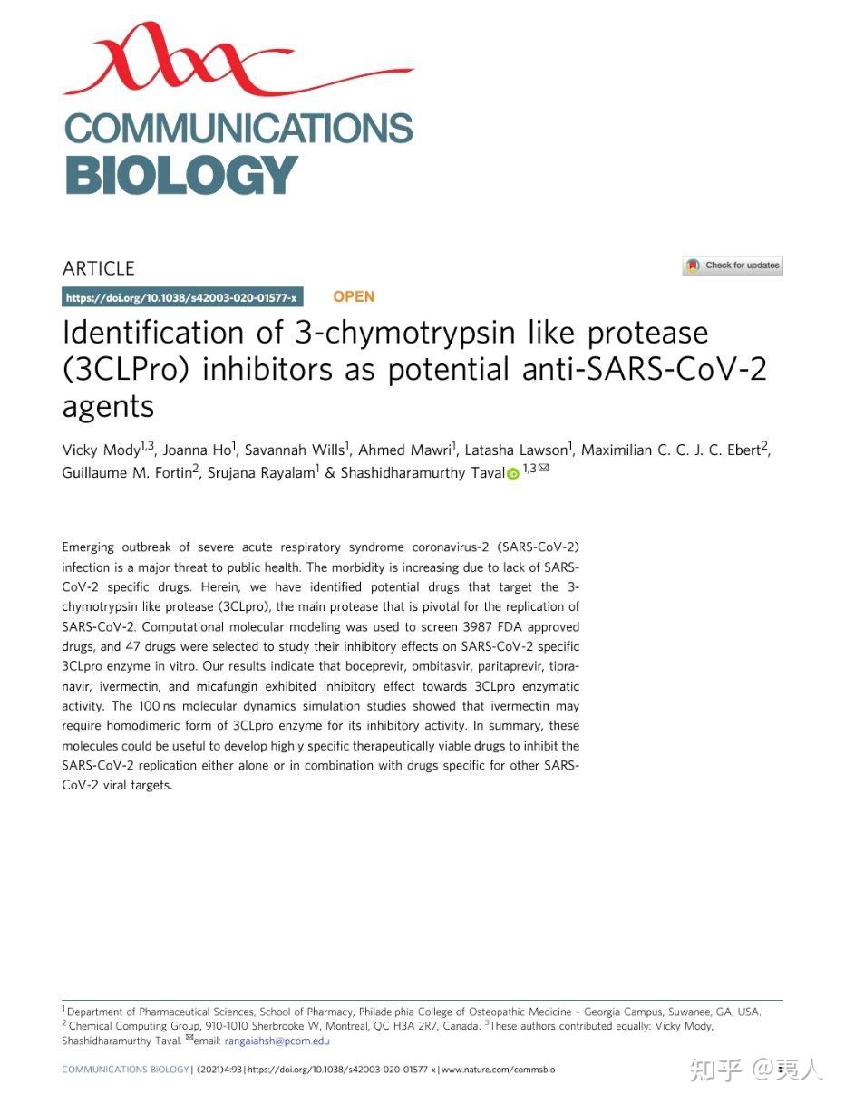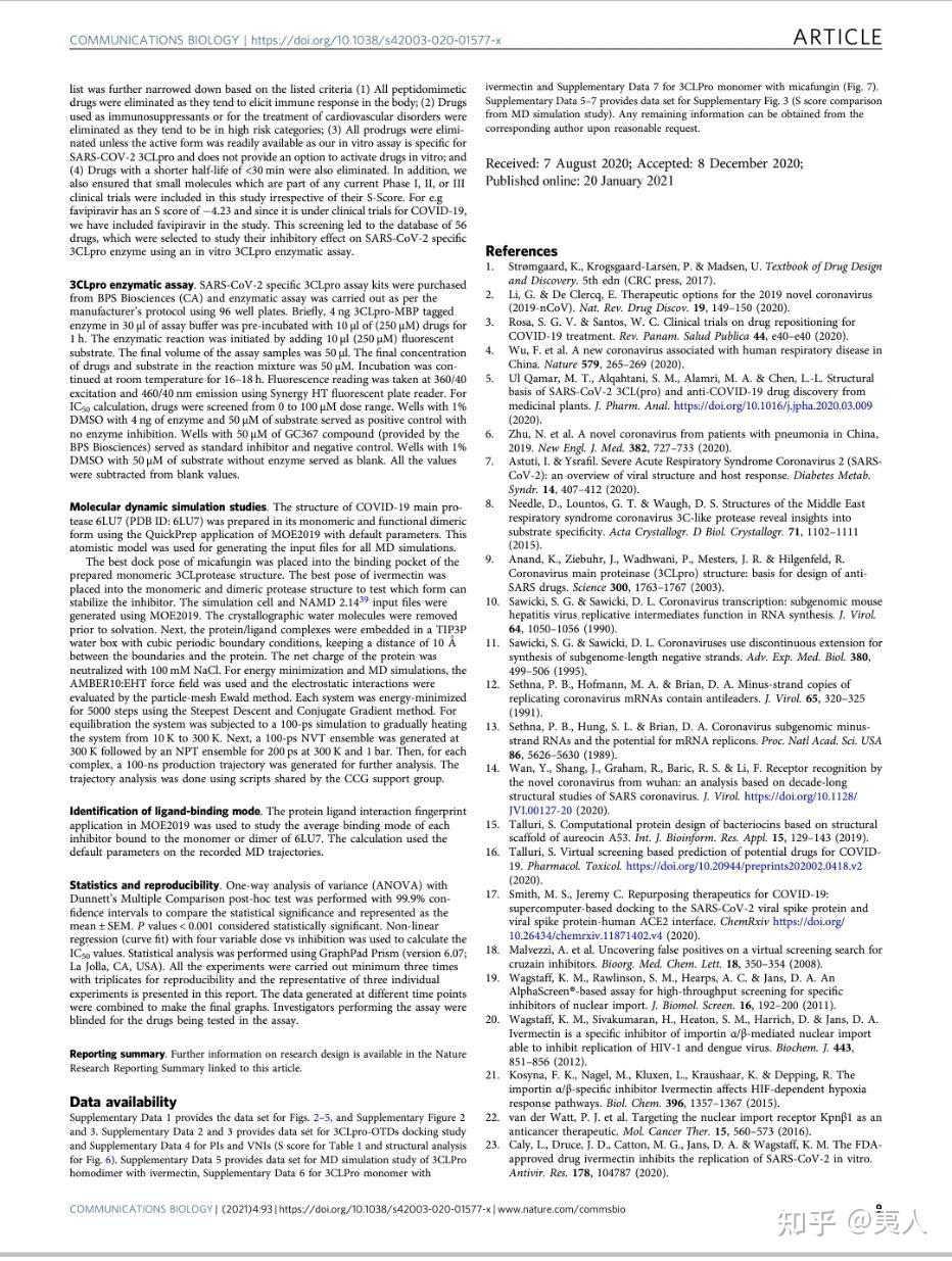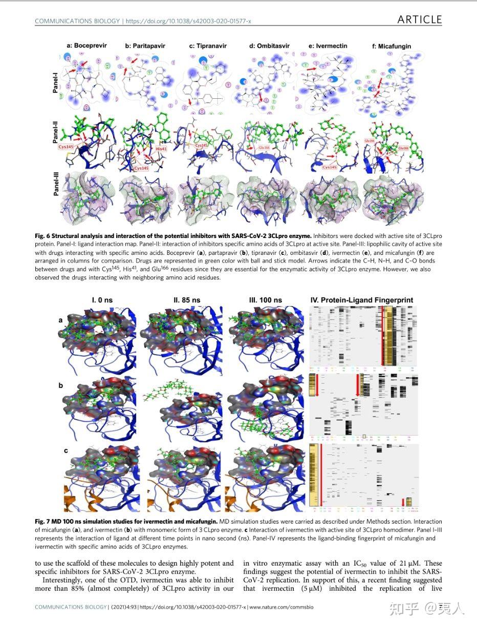 新冠病毒 (SARS-CoV-2) 感染的新爆发是对公共卫生的主要威胁。 由于缺乏新冠特异性药物,发病率正在增加。 在此,3-胰凝乳蛋白酶样蛋白酶 (3CLpro) 是 新冠病毒复制的关键蛋白酶,我们以3CL蛋白酶作为作用靶点,找到一些潜在的新冠治疗药物。 该研究使用计算分子模型对3987 种 FDA 批准的药物进行筛选,最后选择 47 种药物在体外研究它们对新冠特异性 3CLpro 蛋白酶的抑制作用。 我们的结果表明,boceprevir, ombitasvir, paritaprevir, tipranavir, ivermectin (伊维菌素), 以及 micafungin 对 3CLpro 蛋白酶活性表现出抑制作用。 100 ns 分子动力学模拟研究表明,伊维菌素可能需要 3CLpro 酶变成同型二聚体后才发挥其抑制活性。 总之,这些分子可用于开发高度特异性的治疗药物,它们可以单独或与针对新冠病毒其他作用位点的特异性药物联合使用,以抑制新冠病毒的复制能力。”