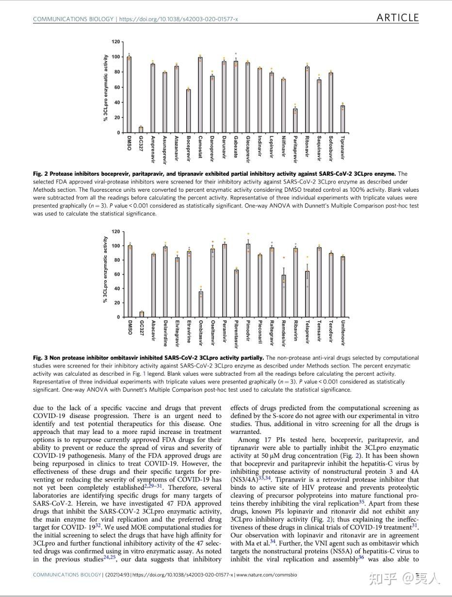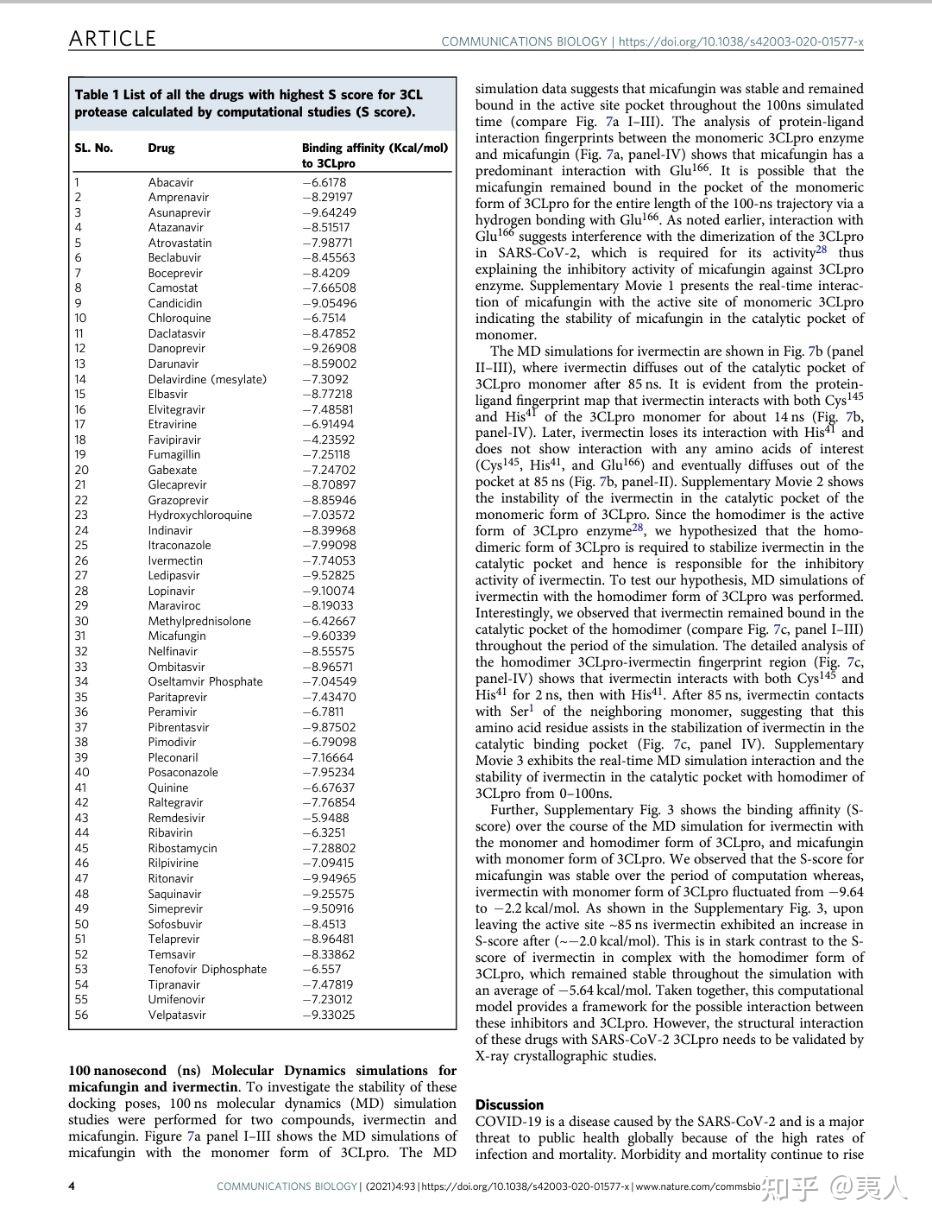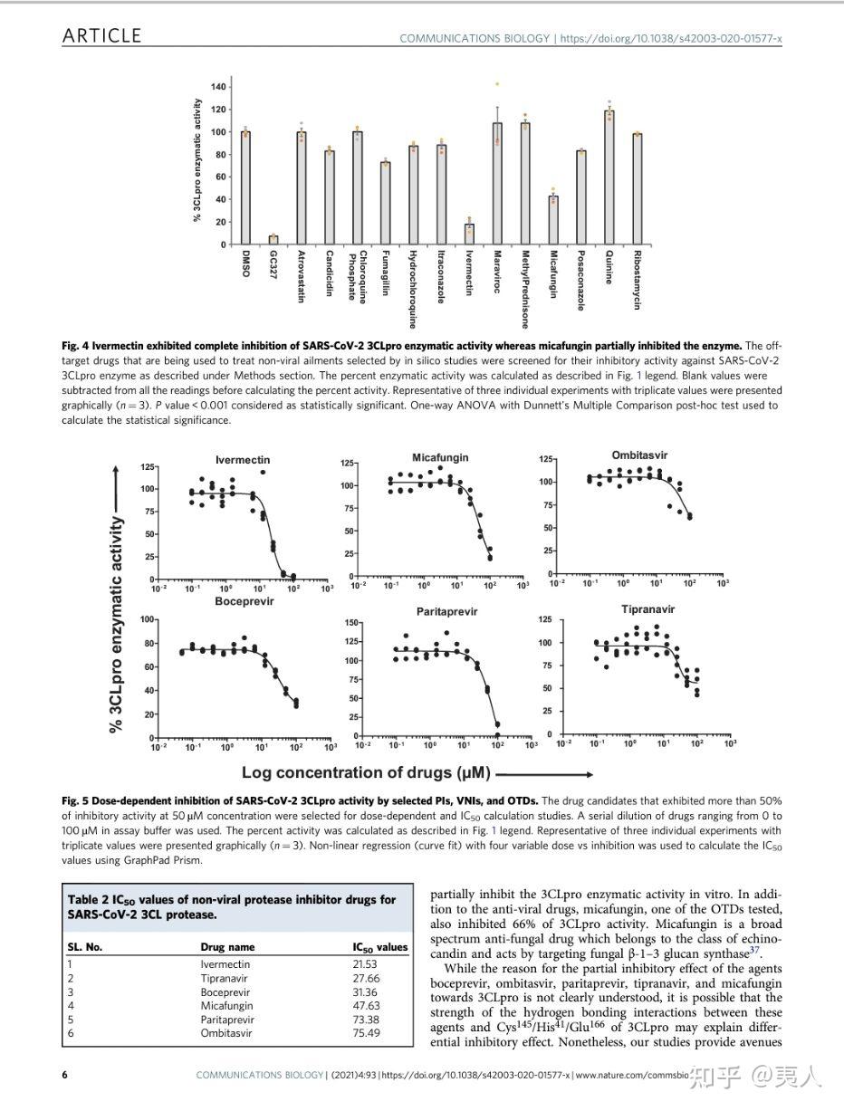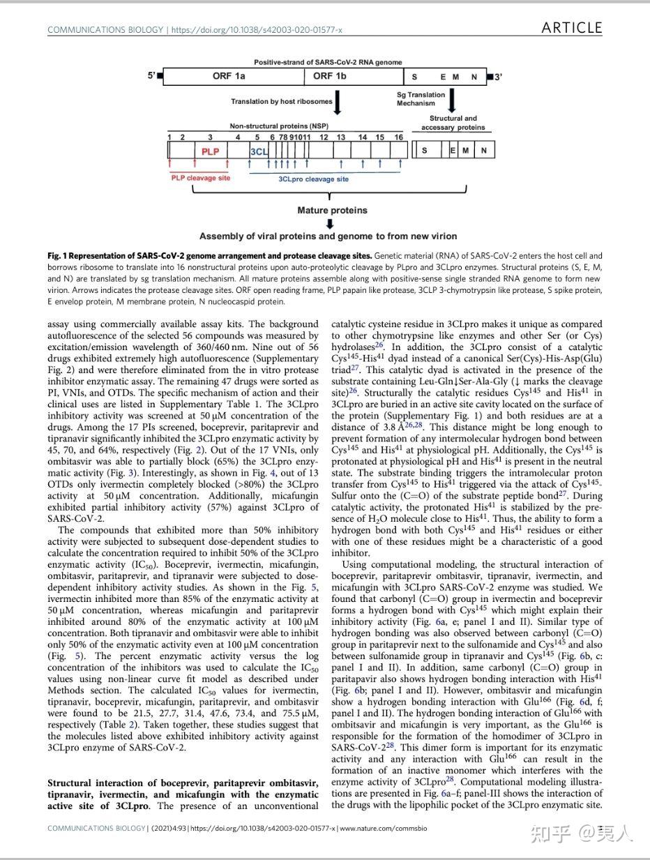 新冠病毒 (SARS-CoV-2) 感染的新爆发是对公共卫生的主要威胁。 由于缺乏新冠特异性药物,发病率正在增加。 在此,3-胰凝乳蛋白酶样蛋白酶 (3CLpro) 是 新冠病毒复制的关键蛋白酶,我们以3CL蛋白酶作为作用靶点,找到一些潜在的新冠治疗药物。 该研究使用计算分子模型对3987 种 FDA 批准的药物进行筛选,最后选择 47 种药物在体外研究它们对新冠特异性 3CLpro 蛋白酶的抑制作用。 我们的结果表明,boceprevir, ombitasvir, paritaprevir, tipranavir, ivermectin (伊维菌素), 以及 micafungin 对 3CLpro 蛋白酶活性表现出抑制作用。 100 ns 分子动力学模拟研究表明,伊维菌素可能需要 3CLpro 酶变成同型二聚体后才发挥其抑制活性。 总之,这些分子可用于开发高度特异性的治疗药物,它们可以单独或与针对新冠病毒其他作用位点的特异性药物联合使用,以抑制新冠病毒的复制能力。”