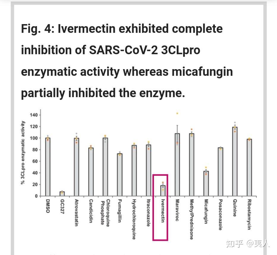 读者可注意到,伊维菌素不仅有活性,而且表现极为优越,在50 μM 浓度下具备高于80%的3CL蛋白酶抑制活性。